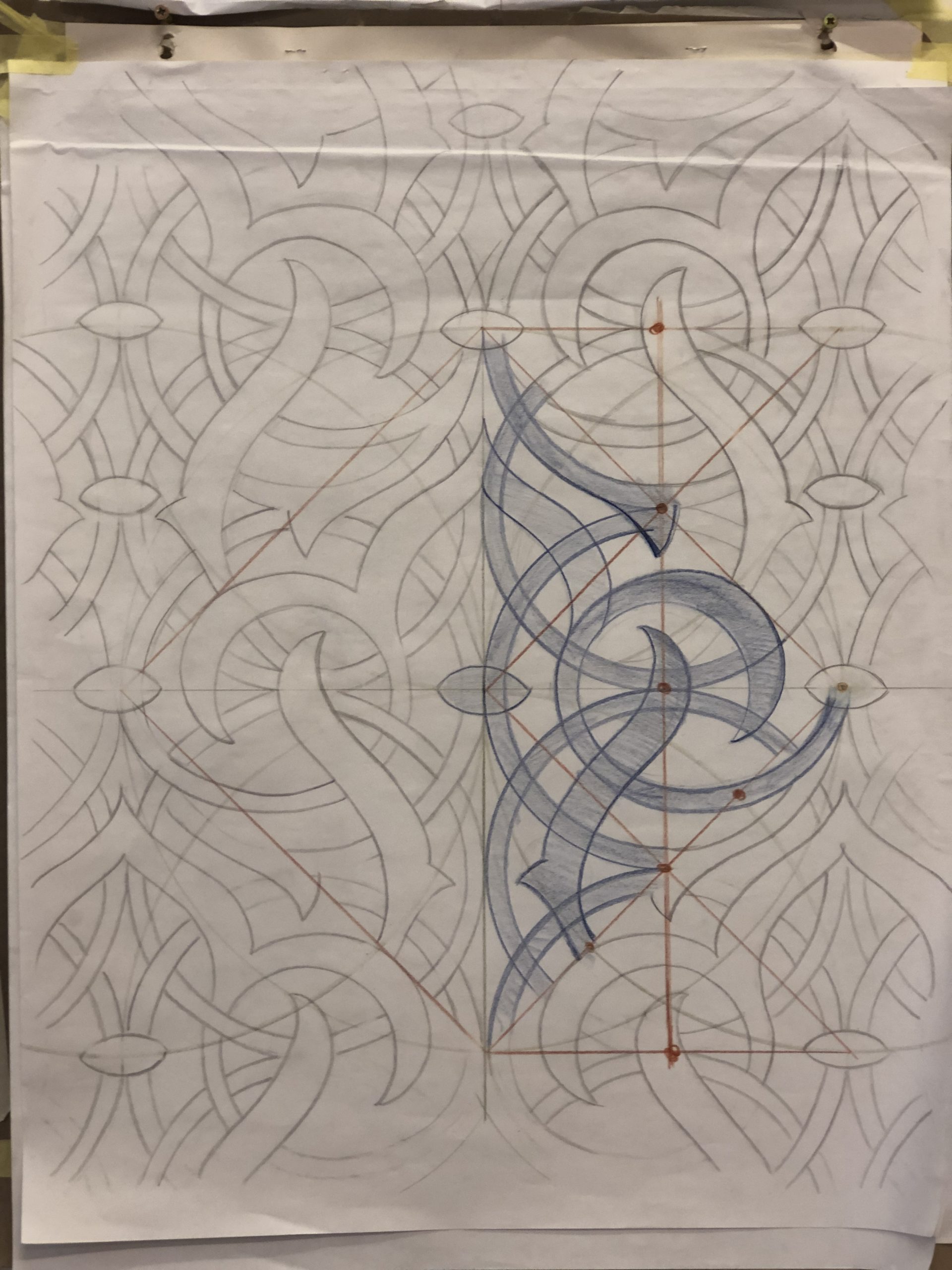 This method of using dynamic squares or rhombs as a device to repeat biomorphic patterns across a facade is used in plaster carvings in Morocco and Spain. When shifting away from reflecting on a vertical and horizontal axis it is harder for the viewer to see the lines of symmetry and the focus can rest on the curvilinear pattern. William Morris was inspired by this Moorish technique when drawing his beautiful wallpapers.