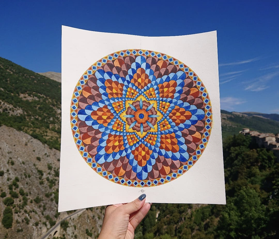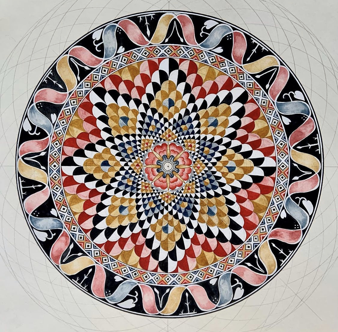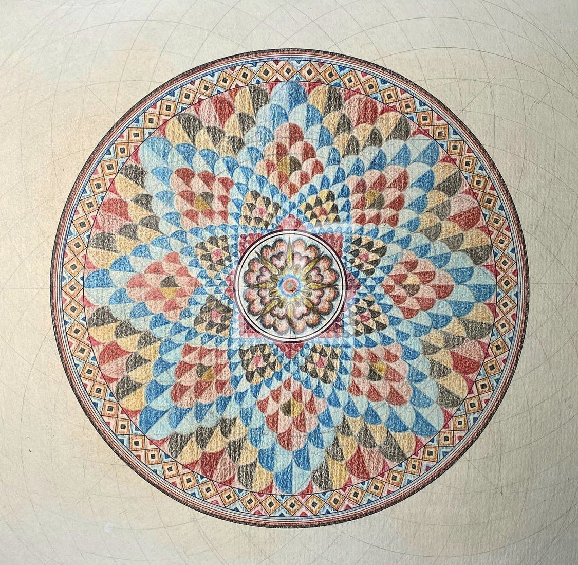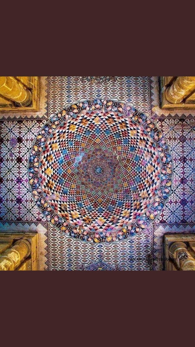 Draw the stunning Umayyad torus khirbat-mosaic patterns from Hisham’s palace in Jericho, Palestine. The mosaic floor in the Great Bath 825m², which is the largest in the Middle East.