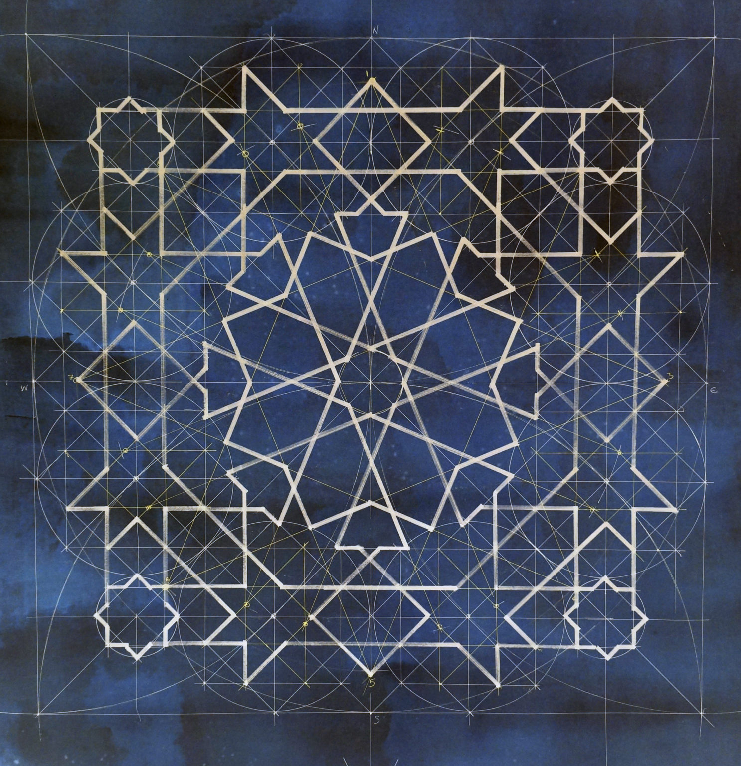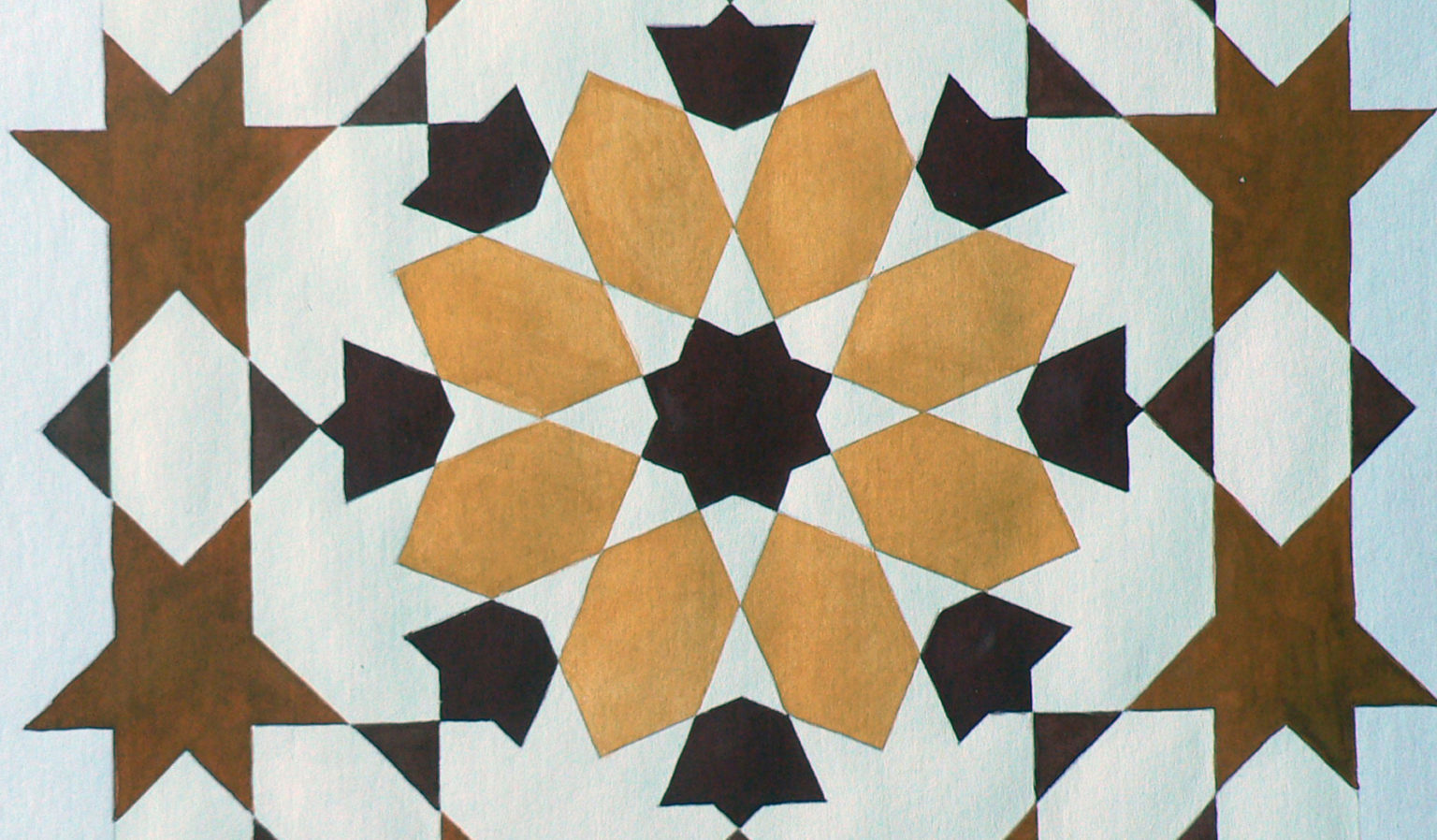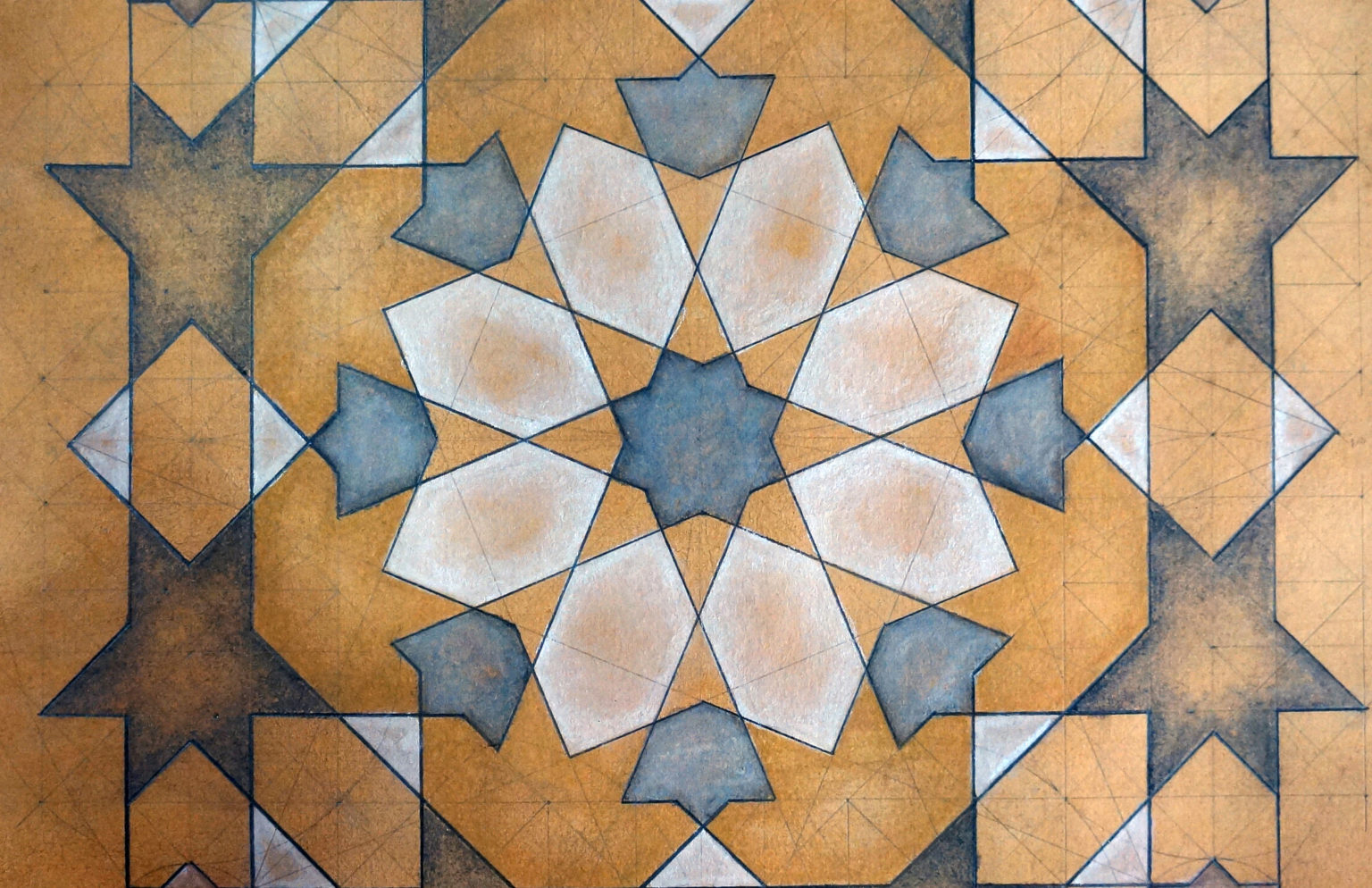 Patterns based upon 8-fold symmetry are found across the Islamic world and represent one of the three main families of symmetry in Islamic geometric art. In this workshop we will recreate the classic Moroccan 16-Fold Rosette surrounded by 8-fold rosettes, framed within an octagon (images above and below). We will consider this design within the context of a wider family of Moroccan designs and demonstrate how to establish the critical proportioning of the individual shapes with 100% accuracy. Each participant will receive a video recording, and supporting material, including a PDF handout detailing the steps undertaken to re-create each pattern, so that students can re-create the design at home after the class. Although this can be taken as a stand-alone workshop, we will build upon themes introduced in earlier workshops in the Exploring Islamic Geometric Patterns Series, which can be downloaded from our archive. (Scroll through gallery in banner above to see images of historical 8-fold designs and former students’ work).