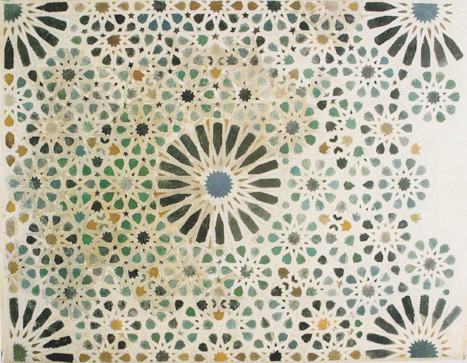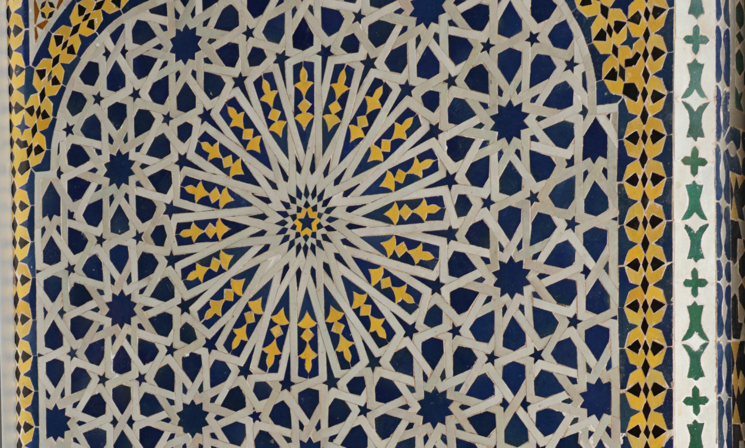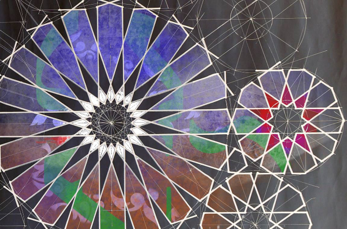 Patterns based upon 5 and 10-fold symmetry are among the most beautiful and subtle found within Islamic art. This week we will be recreating the rare 20-fold rosette design which appears in Alhambra museum (first header image & image below) and in select locations in Morocco. There will be a brief contextual slide lecture and each student will receive a video recording of the workshop, together with PDF handouts and a additional supporting material. Although this can be taken as a stand-alone workshop, we will build upon themes introduced in earlier workshops in this series which can be downloaded from our archive. (Scroll through gallery in banner above to see images of historical 10-fold designs and former students’ work ).